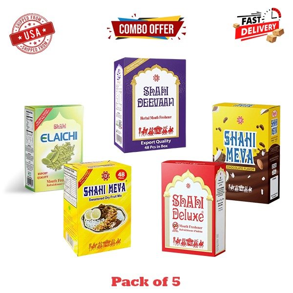 Experience the ultimate Shahi indulgence with our 5 Boxes Value Pack All-in-One Combo Offer! This premium combo brings together the finest flavors of Shahi Meva, Shahi Deluxe, Shahi Elaichi, Shahi Meva Chocolate, and Shahi Deevaan – all in one value-packed offer. Perfect for gifting, family gatherings, or personal enjoyment, this combo delivers a delightful blend of freshness, taste, and tradition.